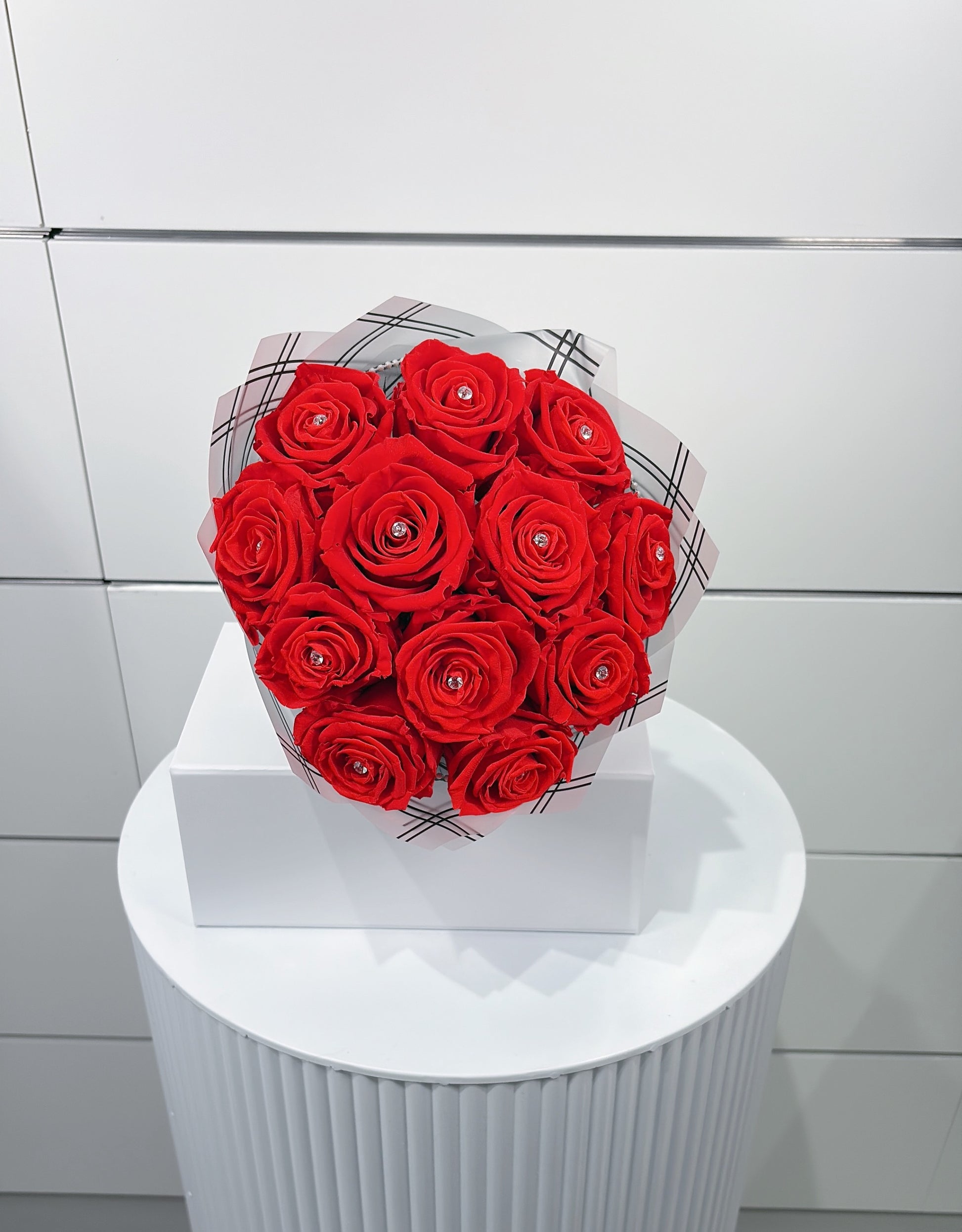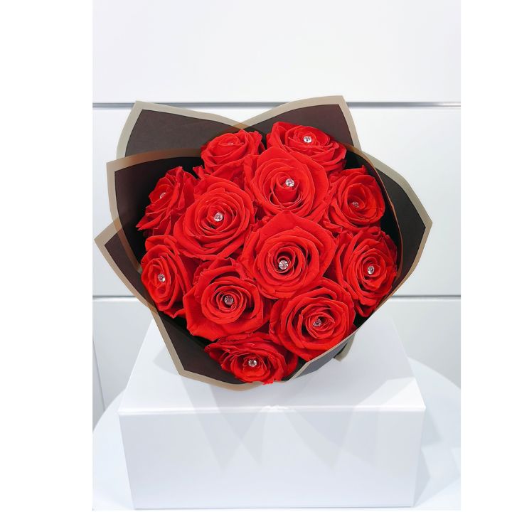 This bouquet of red preserved roses are real roses that can last up to 3 years. This gorgeous bouquet explains the 12 reasons why your special someone is so special for you. This bouquet comes with fancy luxurious paper that adds a touch of elegance to the preserved roses.