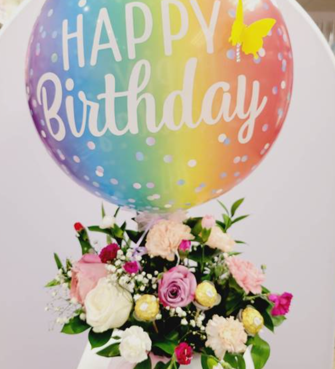 Make your loved one's HBD extra special with our HBD Flower Box. Each box is unique for your very special loved one. Show them how much you care with this one-of-a-kind gift. Colors, balloons, and flowers vary on the season.