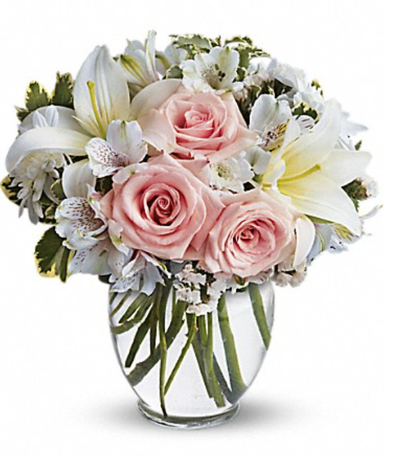 Light pink roses, white asiatic lilies, alstroemeria, cushion spray chrysanthemums and statice are delivered in a stylish vase. Style to spare!