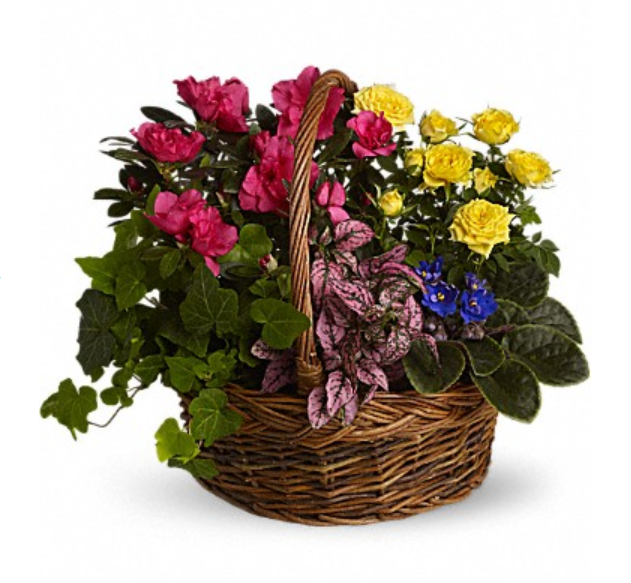 A purple African violet, yellow rose plant, pink azalea, hypoestes and ivy plants are all nestled in a round basket with handle.