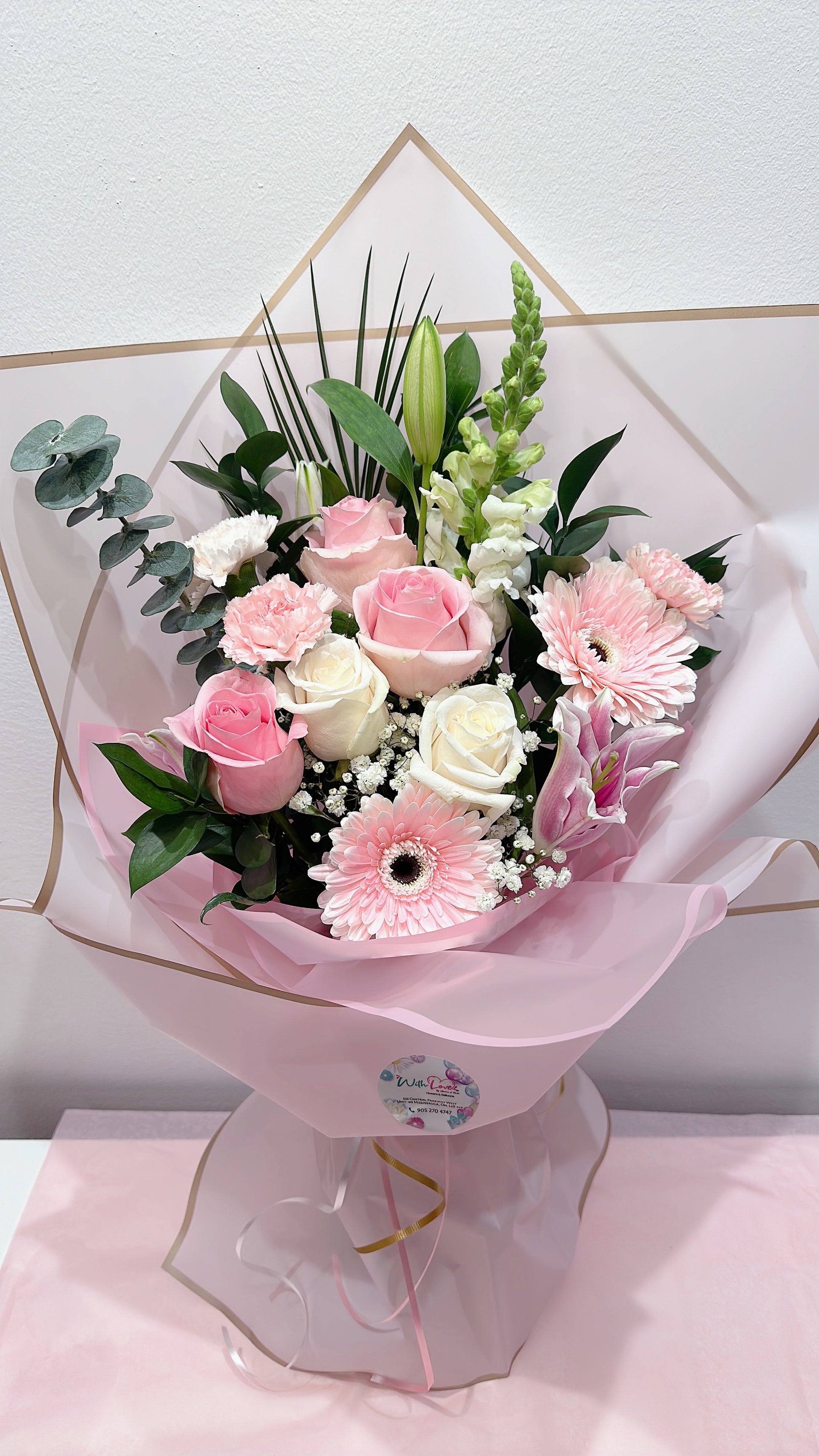 Mix flower bouquet, wrapped in a fancy Korean paper. Flower and color availability may vary based on the season. Similar flowers within the same price range may be utilized instead.