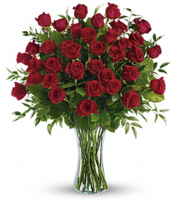 This impressive bouquet includes 36 red roses accented with assorted greenery. Delivered in a flared glass vase.