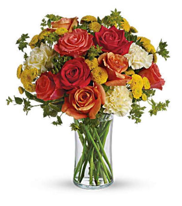 Dark orange, coral and orange roses, light yellow carnations, yellow button spray chrysanthemums and greens fill a slender gathering vase. It's a kiss of summer!