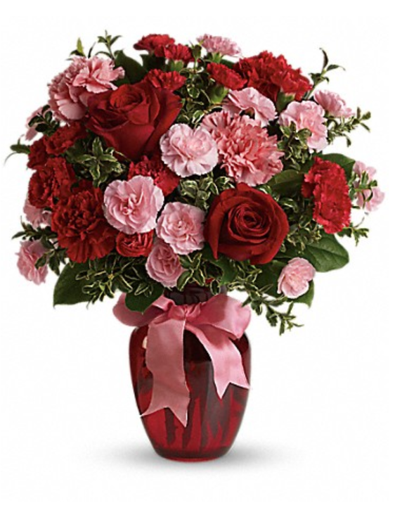 A mix of carnations and roses in shades of red and light pink. Delivered in a glass vase accented with pink satin ribbon.
