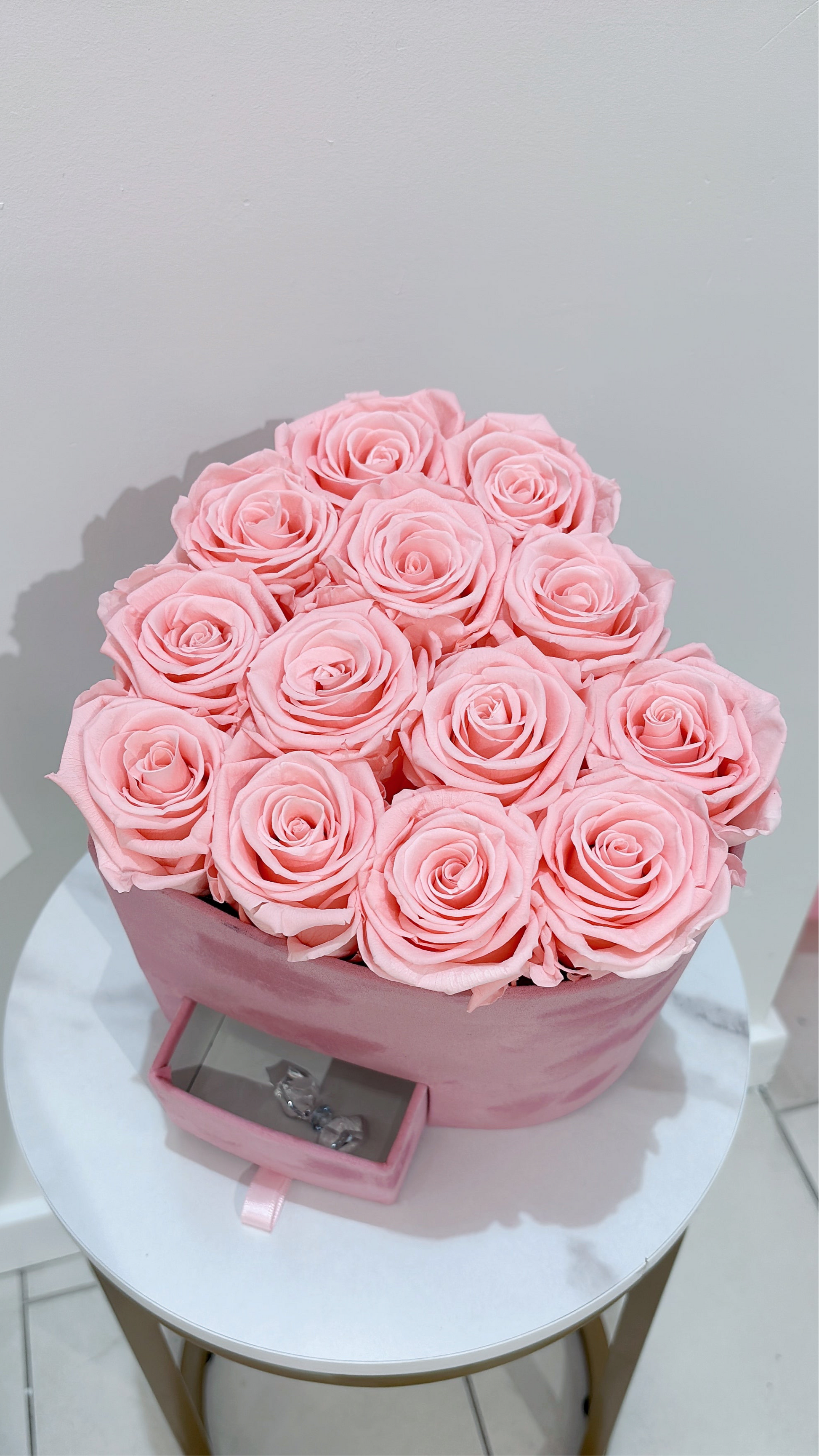 Forever Blush is a luxurious preserved rose box featuring pink preserved roses — that can last for up 3 years. Nestled in a beautifully crafted box that contains a gorgeous jewelry box, this everlasting bloom symbolizes grace, love, and enduring beauty.