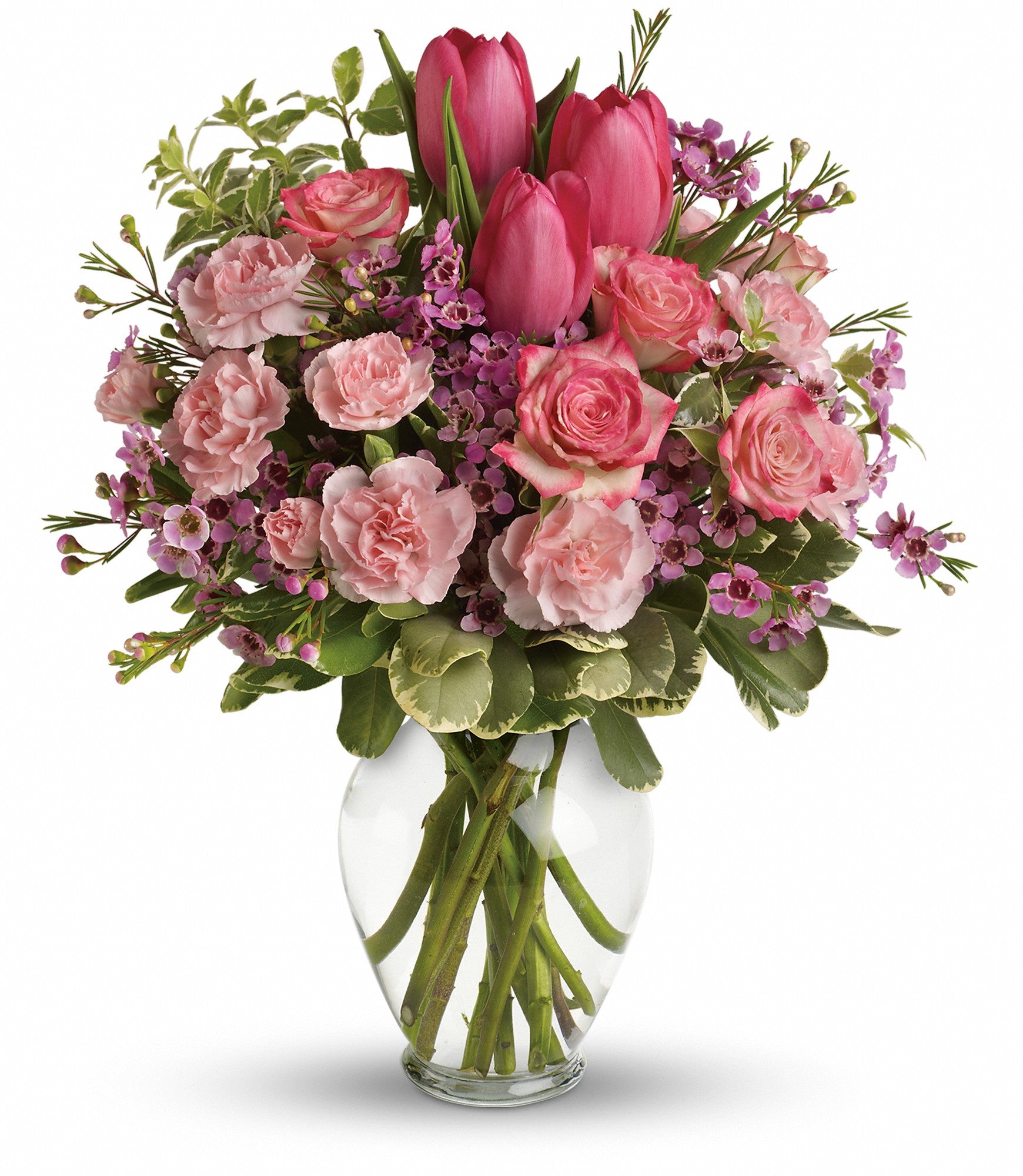 Spring into pink! Delicate roses, tulips and carnations fill a graceful vase with a cheerful expression of your love. It's affection perfection!