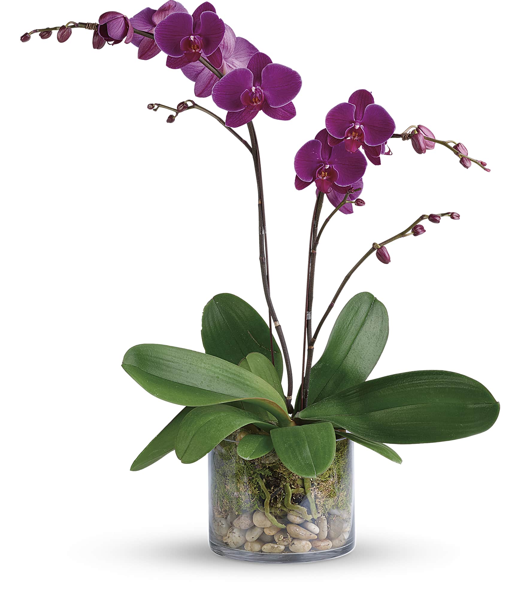 Show your gratitude for a special someone with this glorious living gift. Simply presented in a clear glass cylinder, these alluring purple phalaenopsis orchids add natural elegance to any environment.
