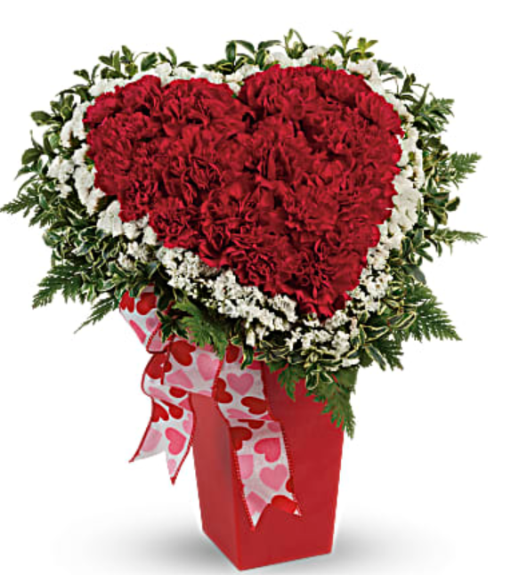 Send someone this soulful floral gift and there'll be no mistaking that you're giving them your heart! A heart made entirely of red carnations is nestled in a cloud of sinuata statice and greenery and presented in a tall red vase adorned with a pretty ribbon.