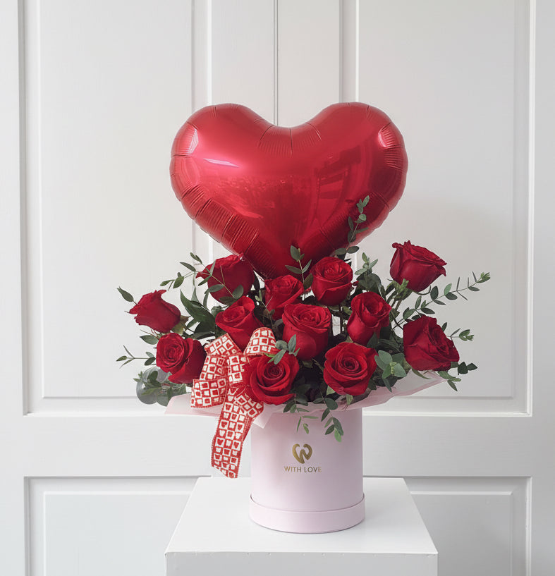 Say everything that your heart feels! This arrangement features premium red roses arranged in an elegant box, complemented by a red heart balloon. This heartfelt gift is elegant, luxurious, and full of meaning. It’s the perfect way to surprise someone special.
