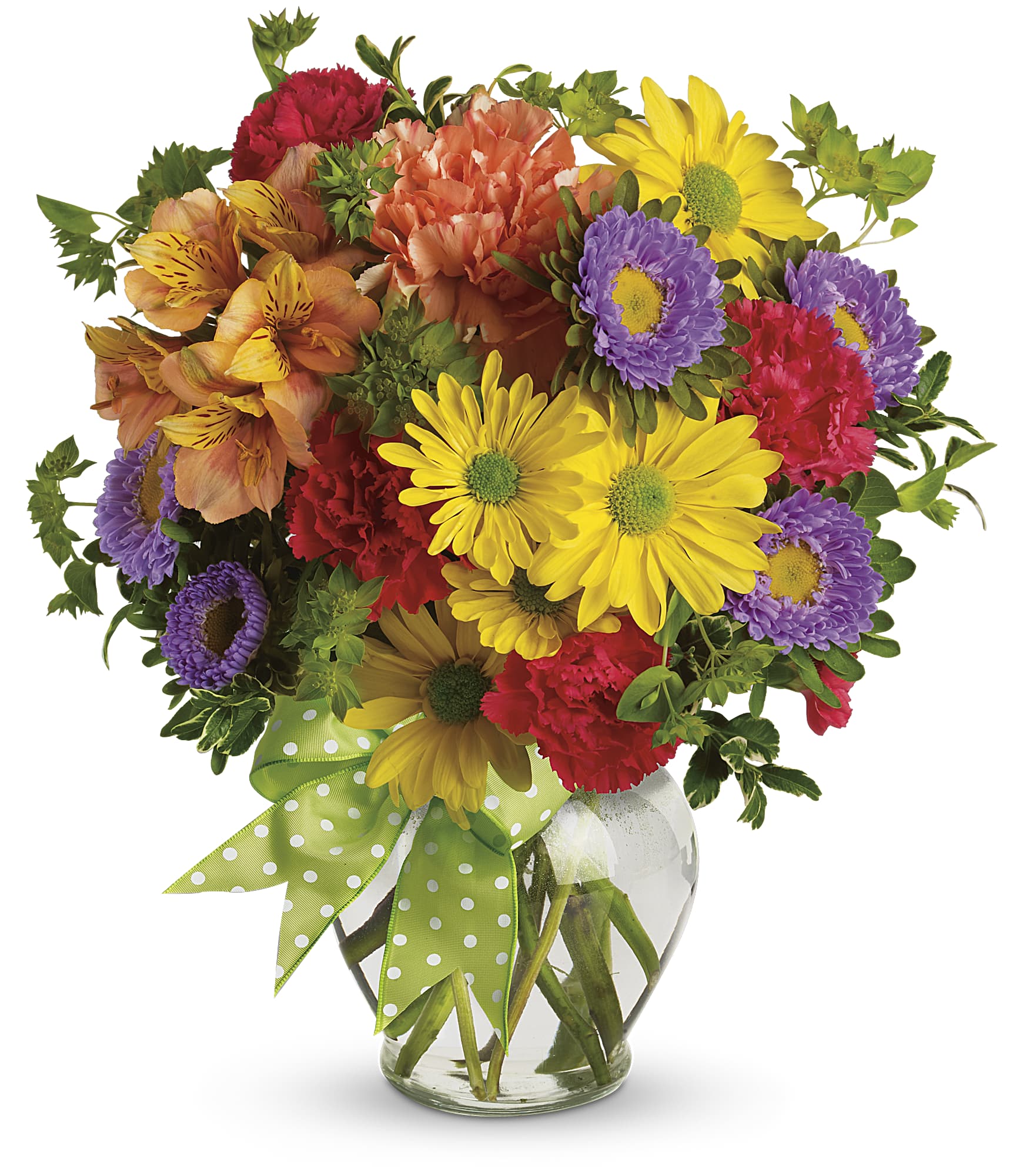 A summery mix of yellow daisy chrysanthemums, purple asters and red and orange carnations - arranged in a clear ginger vase and adorned with a cheerful green plaid bow - will make their wishes come true!
