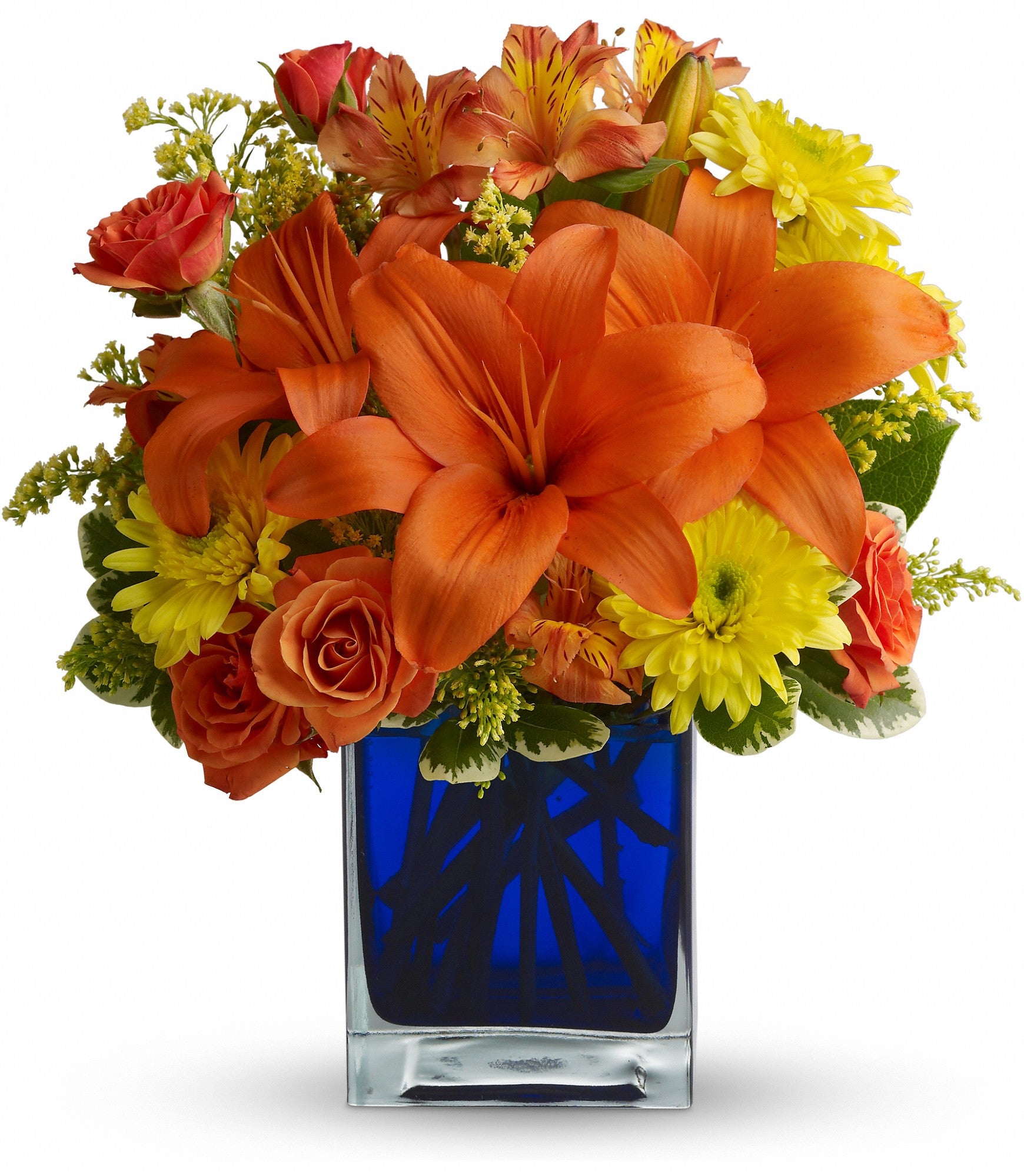 The radiant bouquet includes orange Asiatic lilies, orange alstroemeria, yellow cushion spray chrysanthemums, solidago and orange spray roses accented with assorted greenery. Delivered in a blue contemporary glass cube vase.