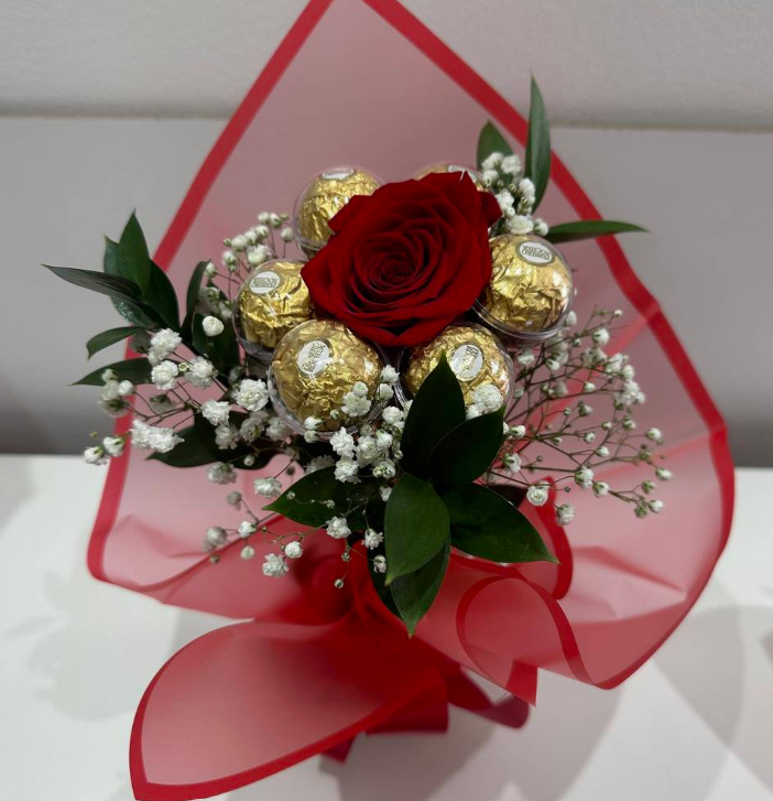 Experience a nice day with Sweet Day! Embrace the beauty of a single rose, elegantly surrounded by the finest Ferrero Rocher chocolates! Indulge in this perfect blend of sweetness and romance!