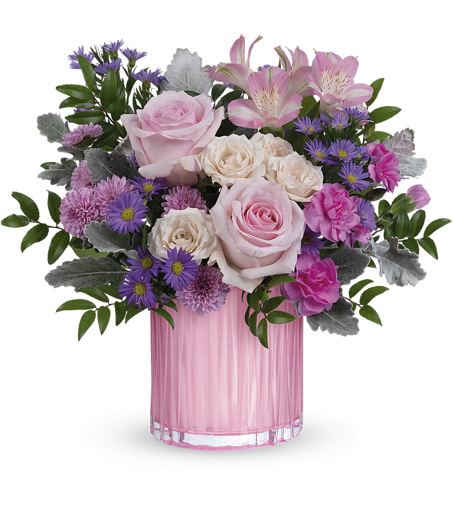 Mother's Day is rosy posy perfect when this gorgeous gift arrives! The beautiful bouquet looks ultra luxe in a pearlescent pink glass vase with stylish sculpted details.