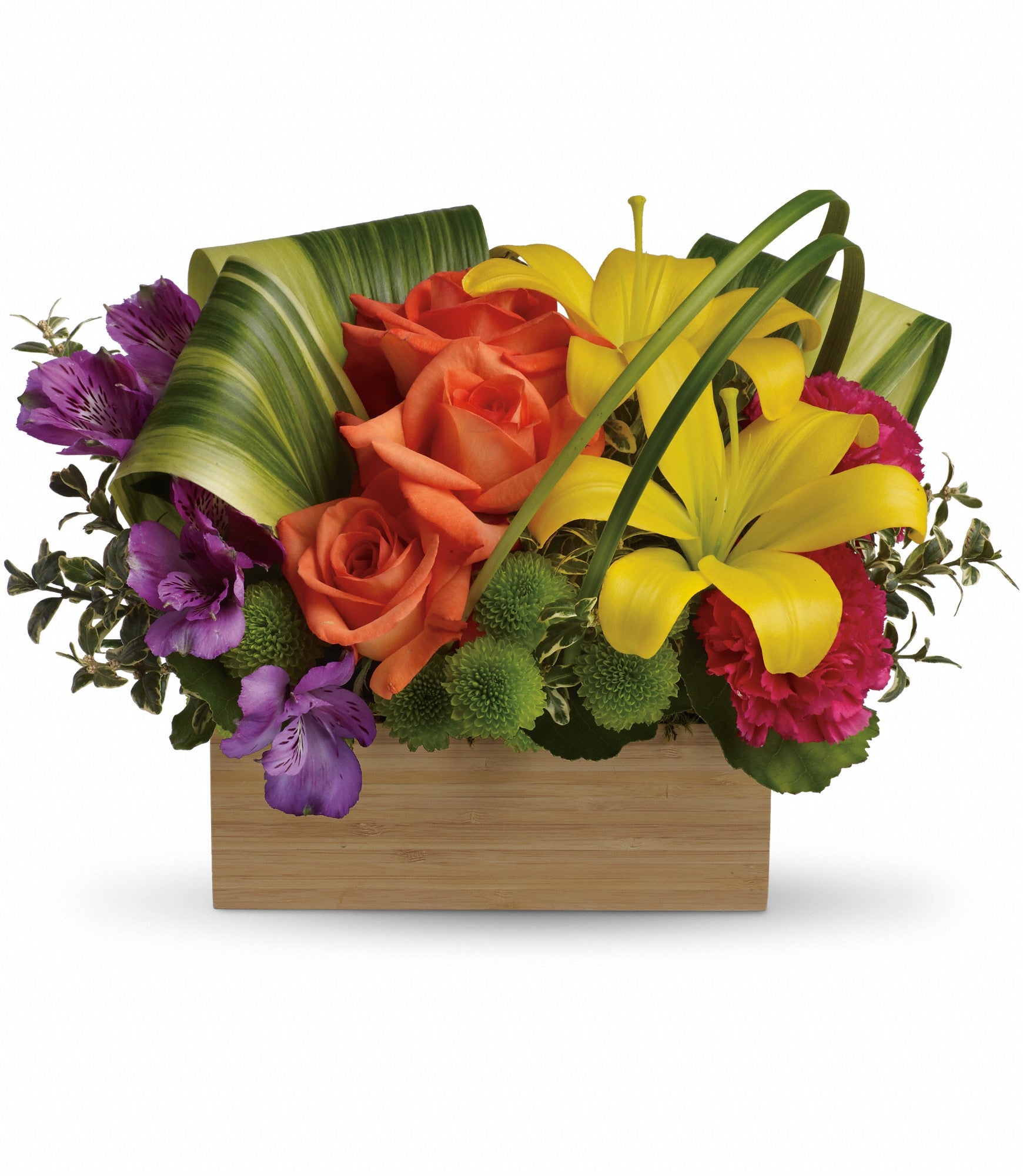 Send her a rainbow! Golden lilies, radiant roses and regal alstroemeria burst brilliantly from a contemporary bamboo box. What a chic, stunning way to brighten her day!