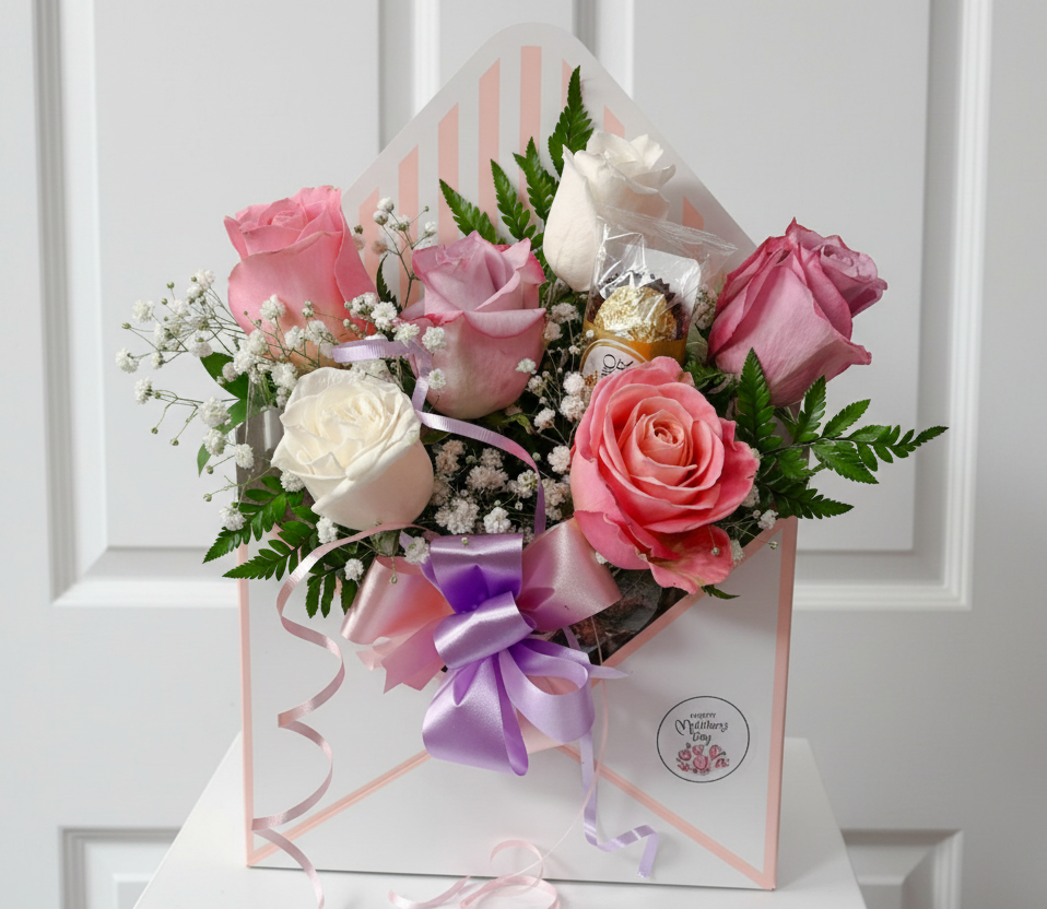 Send a letter and spend time with your loved ones with the Timeless Love Letter. This arrangement features a mix of lavender, pink and white roses, along with baby breath and some Ferrero Rocher chocolates inside a luxury envelope. It's perfect for any special occasion.