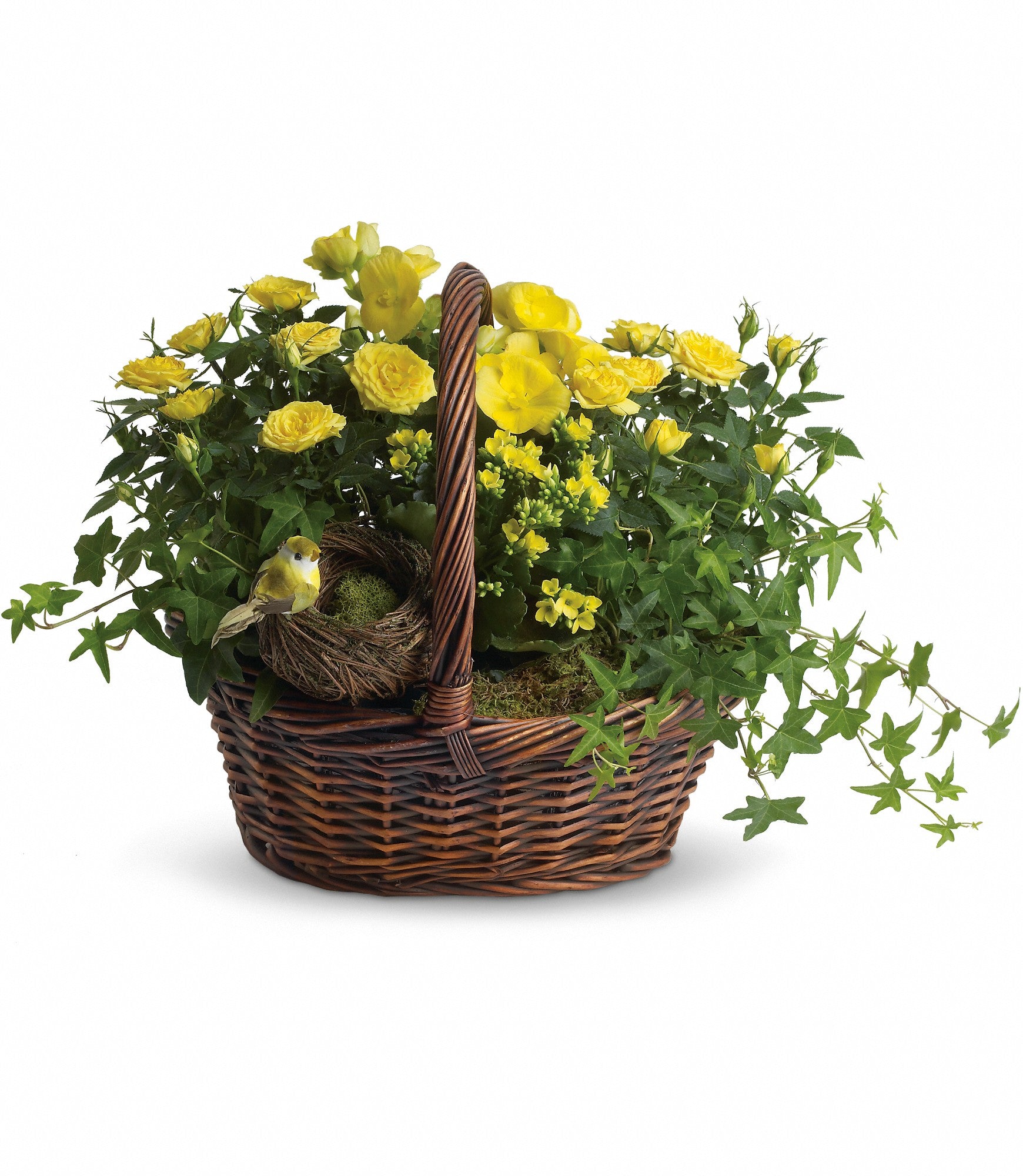 Two bright yellow miniature rose plants, plus a yellow kalanchoe and begonia are nestled right beside the little bird and her nest. It's all delivered in a charming round basket. It sends three times the cheer! Approximately 23" W x 16" H