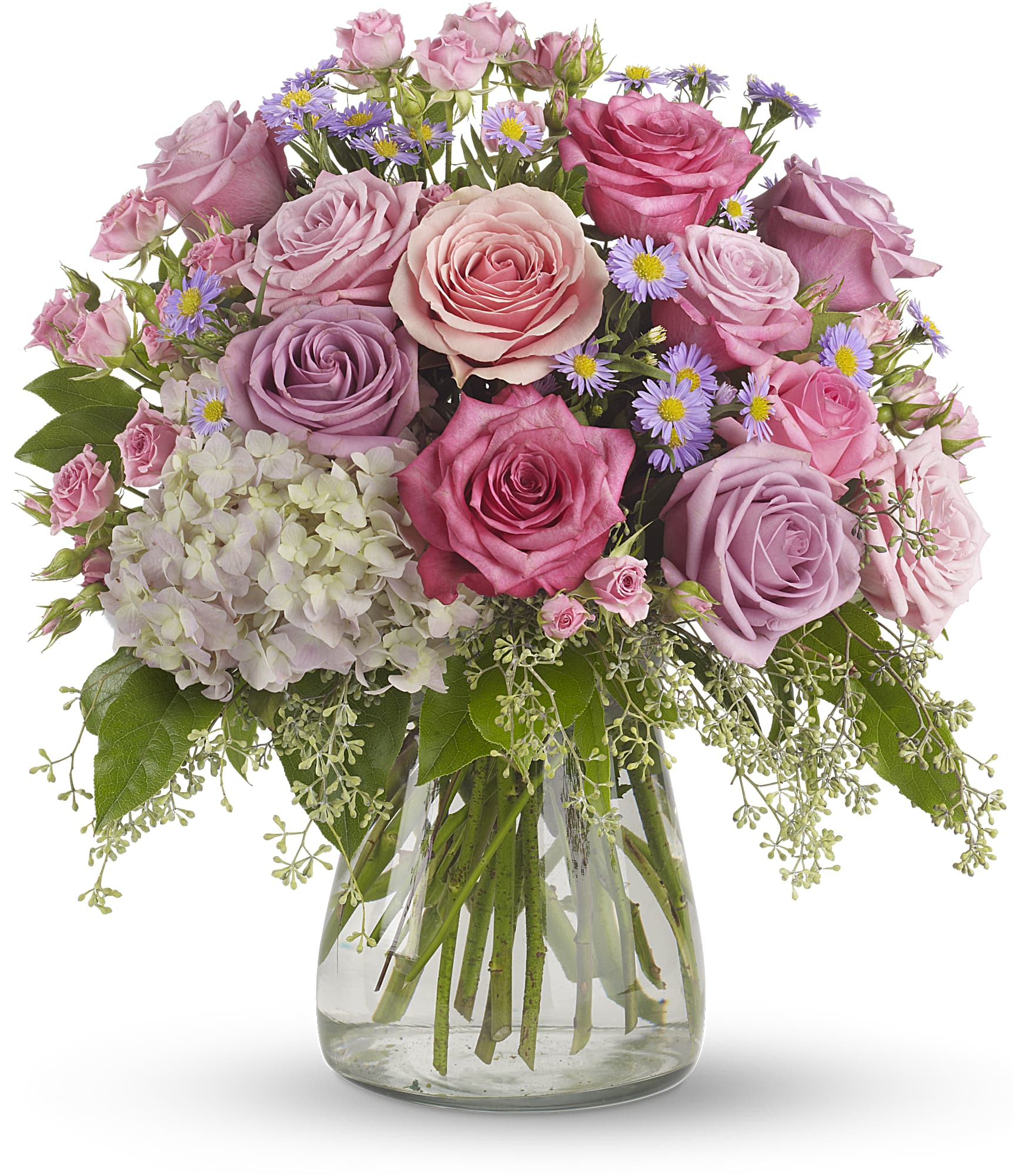 Lavender and pink flowers such as roses, hydrangea, monte cassino asters, eucalyptus and salal are arranged in a clear glass hurricane vase. Approximately 15 1/2" W x 17" H
